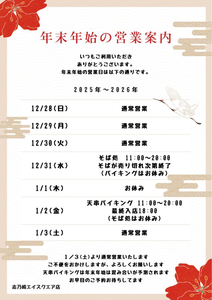 | 営業時間 | うどん・そば/ AM11:00~PM3:00 ( 2:00 オーダーストップ) 天串バイキング/ PM5:00~PM 10:00(PM8:30オーダーストップ) |